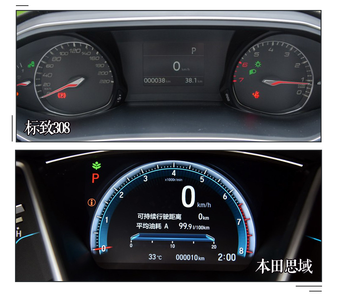 标致308的仪表盘非常有意思,逆时针转动的发动机转速表是最大的亮点。思域仪表盘中间是一块大面积的液晶屏,可以显示多种信息。标致308在开启运动模式后,我们将会看到在仪表看到发动机功率,扭矩以及涡轮压力值,这点思域同样也有。