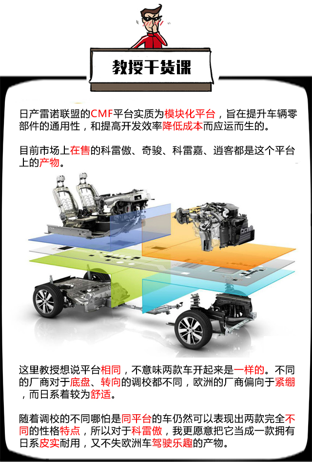 这款混三国血统于一身的车,继承了日本成熟可靠的动力系统、法国浪漫的设计、韩国制造,可谓万千宠爱于一身。雷诺-日产联盟下的科雷傲与奇骏同出于—CMF平台,但为了跟这个远方表弟做出区分,雷诺还是做出了一些改变,例如咋配置以及设计上运用了更多新颖的设计,让科雷傲相比奇骏硬生生高了半级。