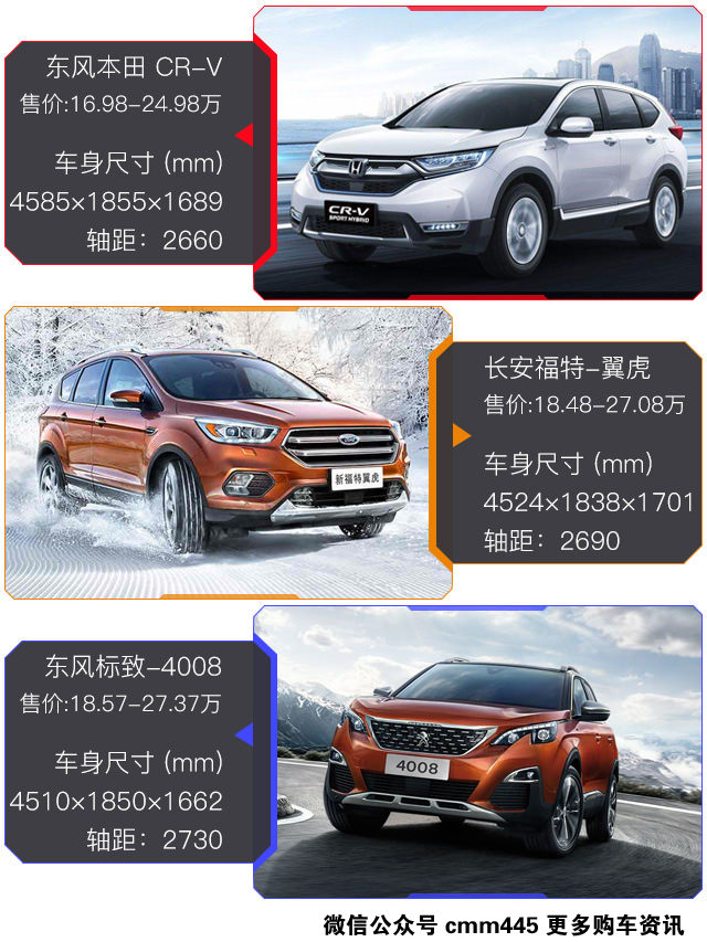 本田全新一代CR-V的到来让同级别其他SUV车型感到空前的压力,目前CR-V在很多地方都出现了提车时间较长的情况,喜欢它的消费者真不少!那么它的竞争力是否足够的出色?为了解决这一疑问虎哥这次就让本田CR-V、福特翼虎、标致4008这三款实力突出的车型来一次全面对比!