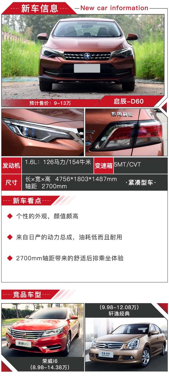 很明显启辰D60实际上就是启辰的日产轩逸,有着类似于日产轩逸的硬件,油耗、空间以及操控方面都会有很高的相似程度。而集合日产轩逸以及启辰D50的官方指导价,一姐估计启辰D60指导价应该在9万起,所面对的对手将会是荣威i6这类型的高品质国产对手。和竞争对手们相比,启辰D60的优势就是自己来自东风日产的支持,有着和合资品牌相差不大的各项指标。所以要是想买一款省心省油的合资车,资金又不足的话,这款中国品牌的启辰D60是不错的选择。
