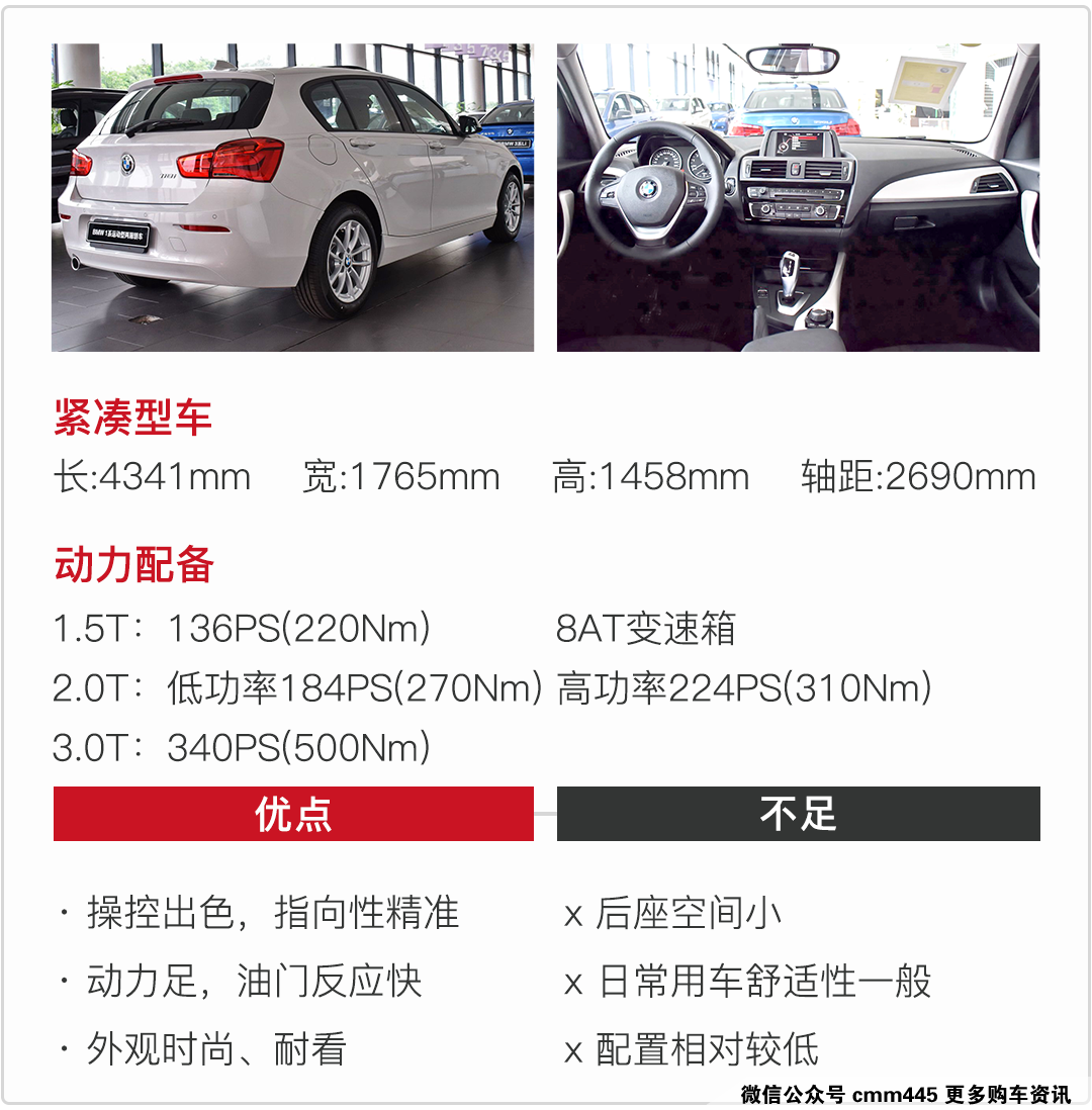 除了宝马3系还有采用进口销售方式的宝马1系,随着定位低一些,车内空间也会小一些,但不变的是档次依然摆在那里,动力、操控也不错。