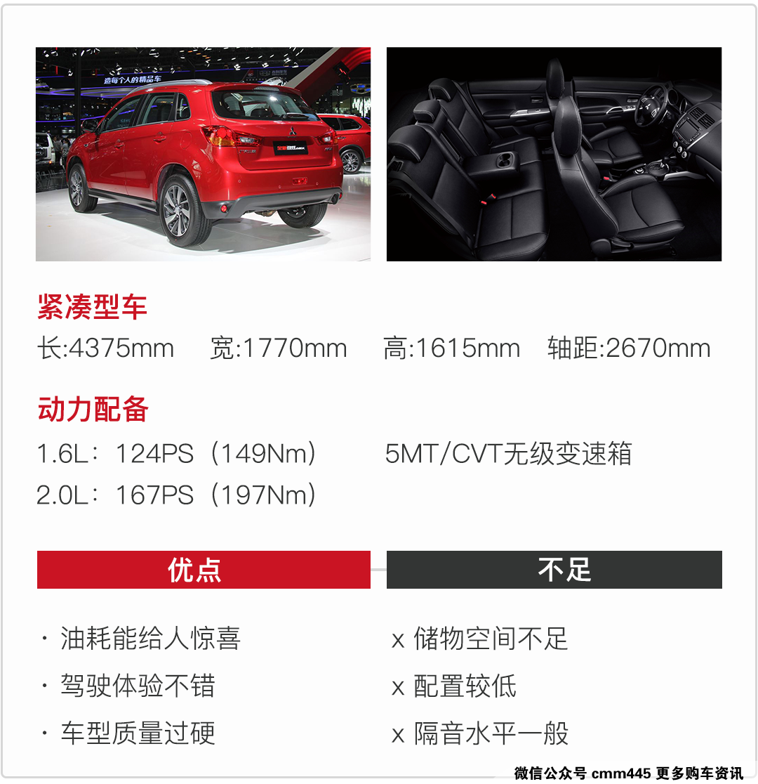 总结:13万的合资紧凑级SUV确实不多,仅有三菱劲炫ASX可选,如果实在看重车型级别的话,也只能选它了......