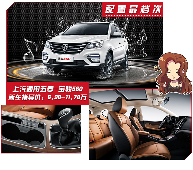 宝骏560被誉为神车并非仅仅是因为它价格低,更因为它的配置非常丰富。十万来块的售价,名牌音响、皮质沙发、新款车型更是使用了双离合变速箱,基本上你能想到的配置都能极大的满足。就这样的售价有这样的配置,已经很具有档次啦~