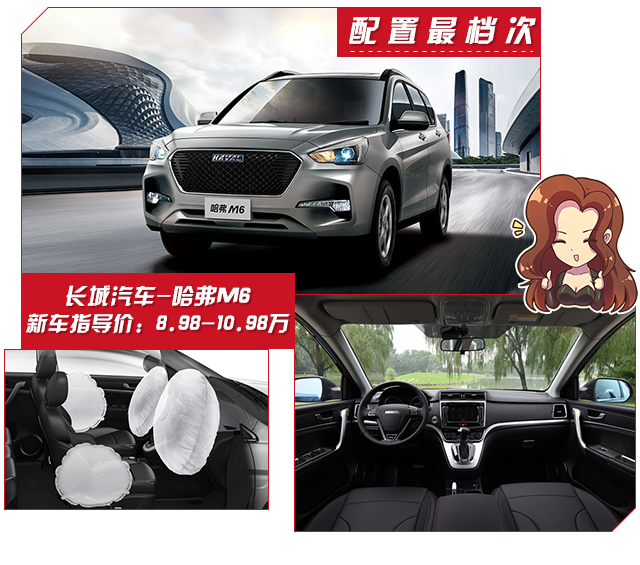 哈弗M6是一款从经典款的哈弗H6衍生而来的紧凑型SUV,在动力总成不变的情况下更改了外观降低了售价,全系带导航、无钥匙进入无钥匙启动功能等消费者很受用的配置,重要的是顶配也不贵~