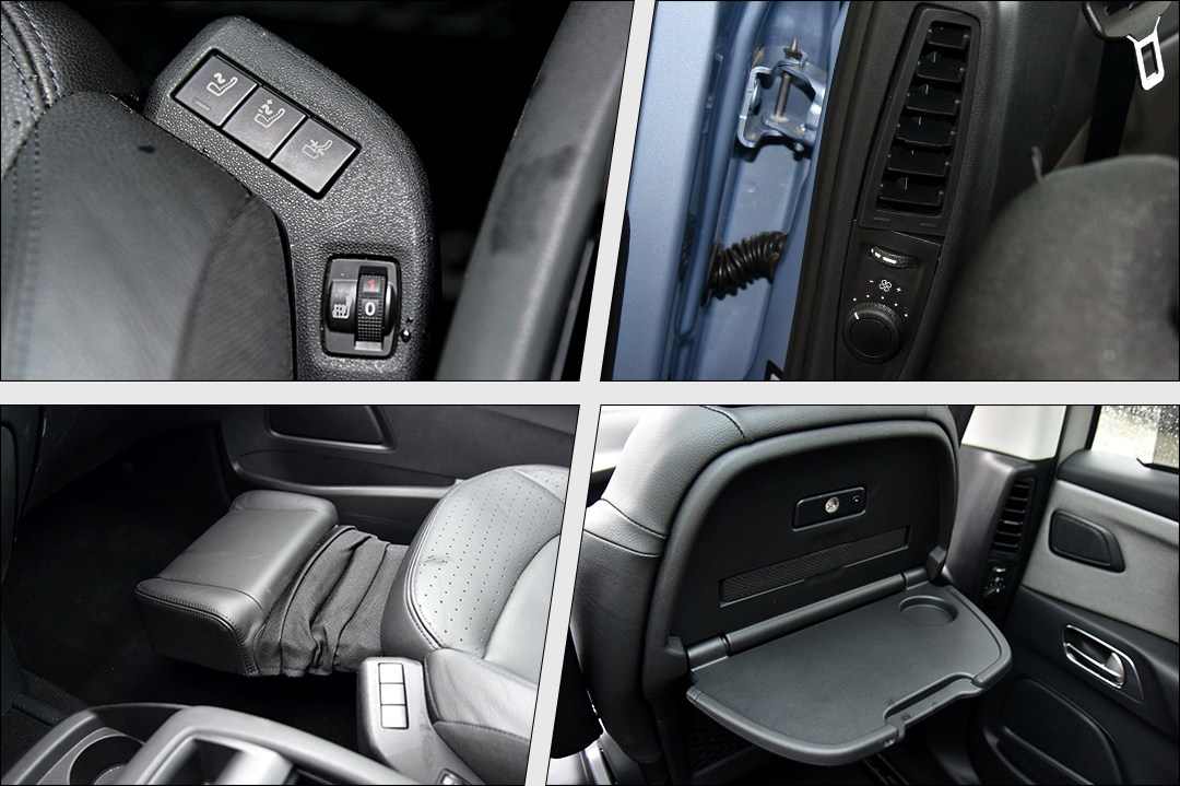 前排座椅带有独立扶手,按摩、加热一应俱全,还有调节范围很大的电动腿托,第二排座椅分别是三个可以四向调节的独立座椅,两侧B柱都有可以单独调节风量的空调出风口,还有带灯光的小桌板。