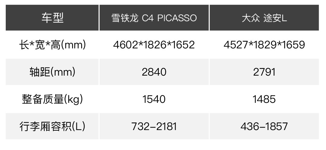 在你没有看到两车的车身尺寸数据之前,你肯定会觉得C4 Picasso比途安L要大不少,其实两车的车身尺寸相差无几,C4 Picasso优胜的地方是行李厢容积,而途安L则是更加丰富的配置。