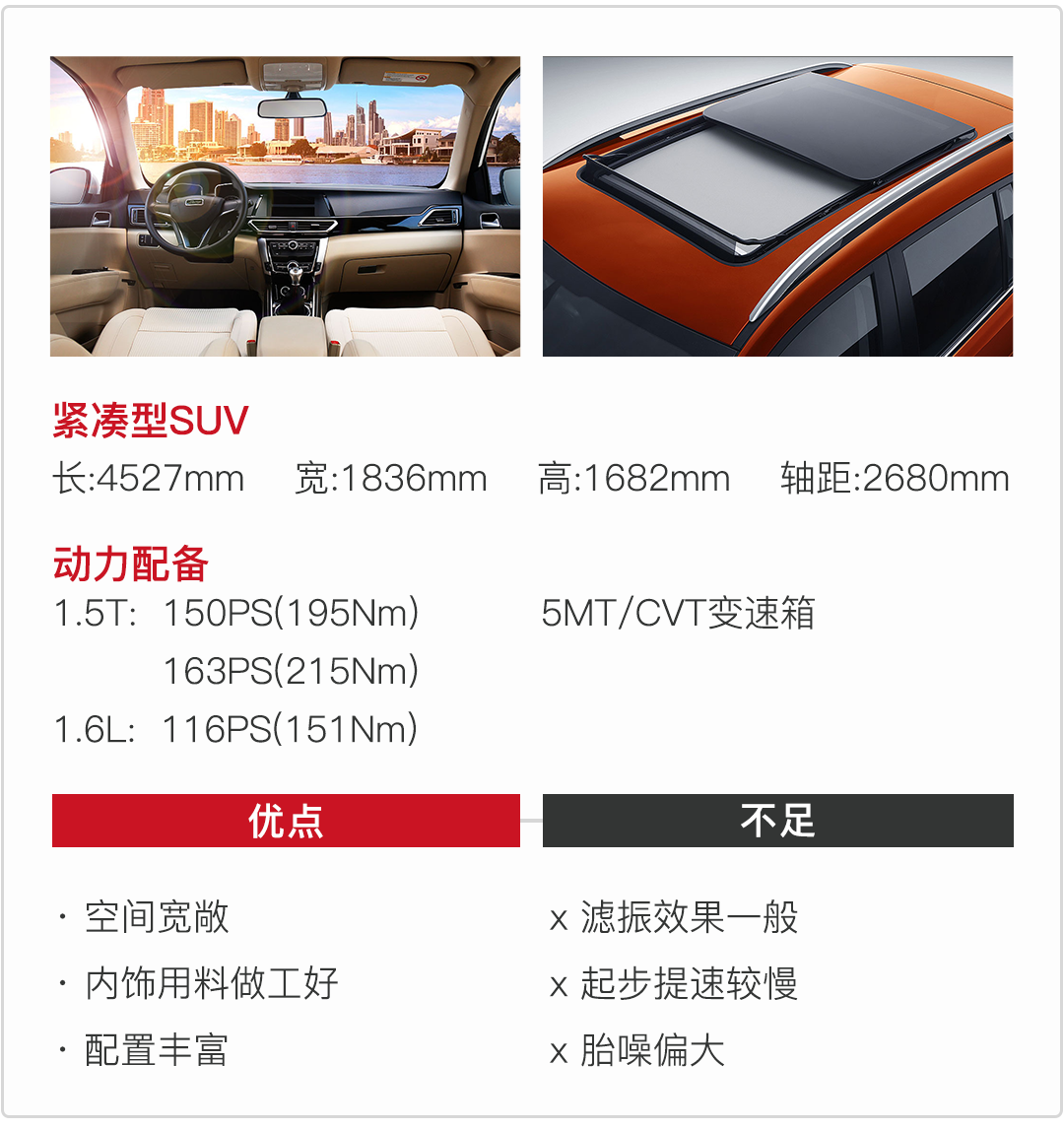 搭载1.3T、1.6L两种发动机,匹配5挡手动以及CVT变速箱,对于1.3T+CVT车型,起步时动力难免有些力不从心,但是当涡轮介入后,动力输出就能够跟上。