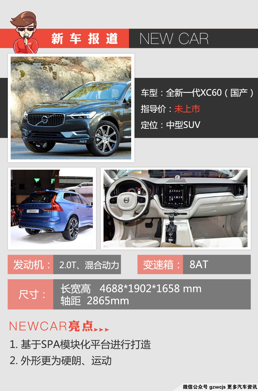 全新一代XC60早前于日内瓦车展发布。作为沃尔沃产品结构中的核心,全新一代XC60基于SPA模块化平台进行打造。沿用了全新S90、XC90身上的家族式设计理念,宽大的六边形进气格栅辅以不对称车标点缀;大灯采用饱受好评的T型“雷神之锤”设计,并与进气格栅相融合;尾灯大胆地采用曲线复杂的L型设计,勾勒出区别其余家族车型的运动特质。大量创新性、硬朗化的设计元素,使其完全跳脱出旧款车型的典雅风格。