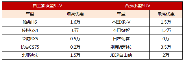 合资小型SUV的优惠比自主紧凑型SUV大得多