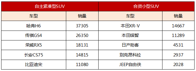 自主紧凑型SUV和合资小型SUV