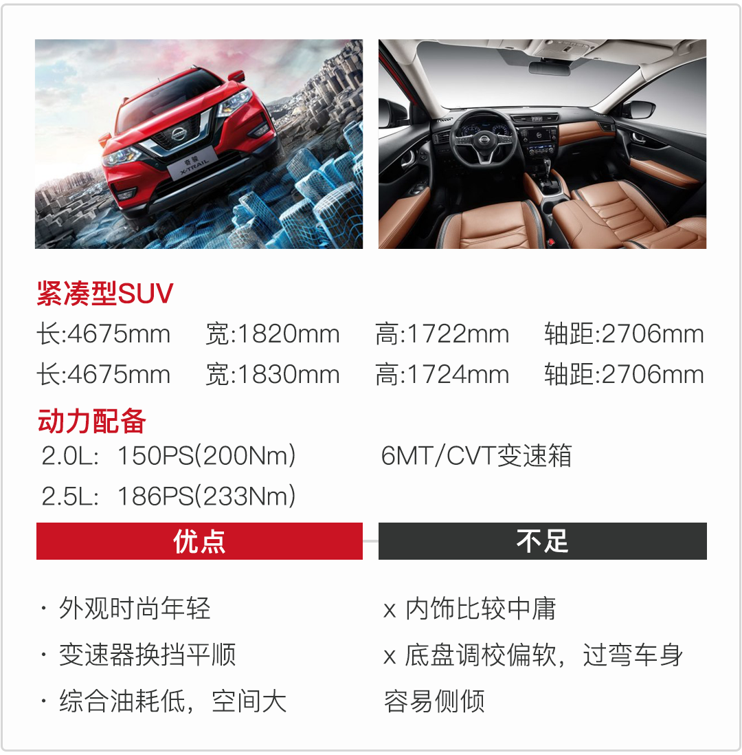 日产奇骏相信大家都很熟悉,凭借着日产成熟可靠的技术,它已经是个久经沙场的老将了。奇骏外观采用了日产最新的设计语言,相比于老款更加年轻时尚,底盘调校柔软,因此带来了良好的滤震性,在驾驶中油门给人的感觉比较灵敏,前段输出比较足。内饰采用撞色设计增添了一定豪华感,中控屏幕下的按钮比较多,分布比较零碎,操作起来不是很方便。后排空间还是很充裕的,毕竟有着“日产大沙发”的称号,乘坐舒适性不会差。但是后排坐垫偏短,支撑性不是很足,还是推荐大家有机会去试乘。值得一提的是,奇骏的四驱版本在日系三巨头中的越野能力是最强的,因为其四驱系统配备了中央多片式离合器的差速器,在路况较差时的脱困能力是很强的,而且现在奇骏也是有优惠的喔。