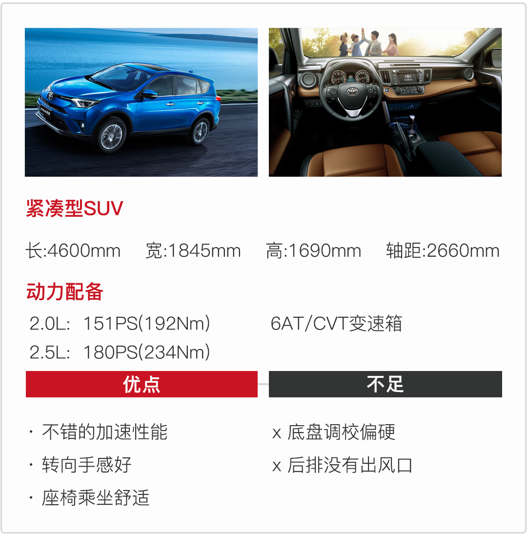 荣放也实力不俗,在这个级别的市场里面也积累了一定的口碑,俗话说,开不坏的丰田,品质是大家有目共睹的。荣放车身线条比较凌厉,迎合了现在汽车市场年轻化的趋势,内饰采用双色设计,层次感强,还是很耐看的。但是全系没有配备后排出风口,这是一个不足的地方。发动机跟变速器匹配很好,驾驶过程中感觉平顺,转向手感建立得挺不错,在操控上能给驾驶者较大的信心。底盘调校比较硬,因此在滤震性比较差,纵然整车的座椅舒适度高,但是因为过硬的底盘调校而使乘坐舒适性大打折扣。乘坐空间能够满足日常需求,并且全系标配全尺寸备胎,这个配置还是比较吸引人的,实际上在日常使用中,全尺寸备胎带来的后备箱地台凸起也是一个值得注意的地方。
