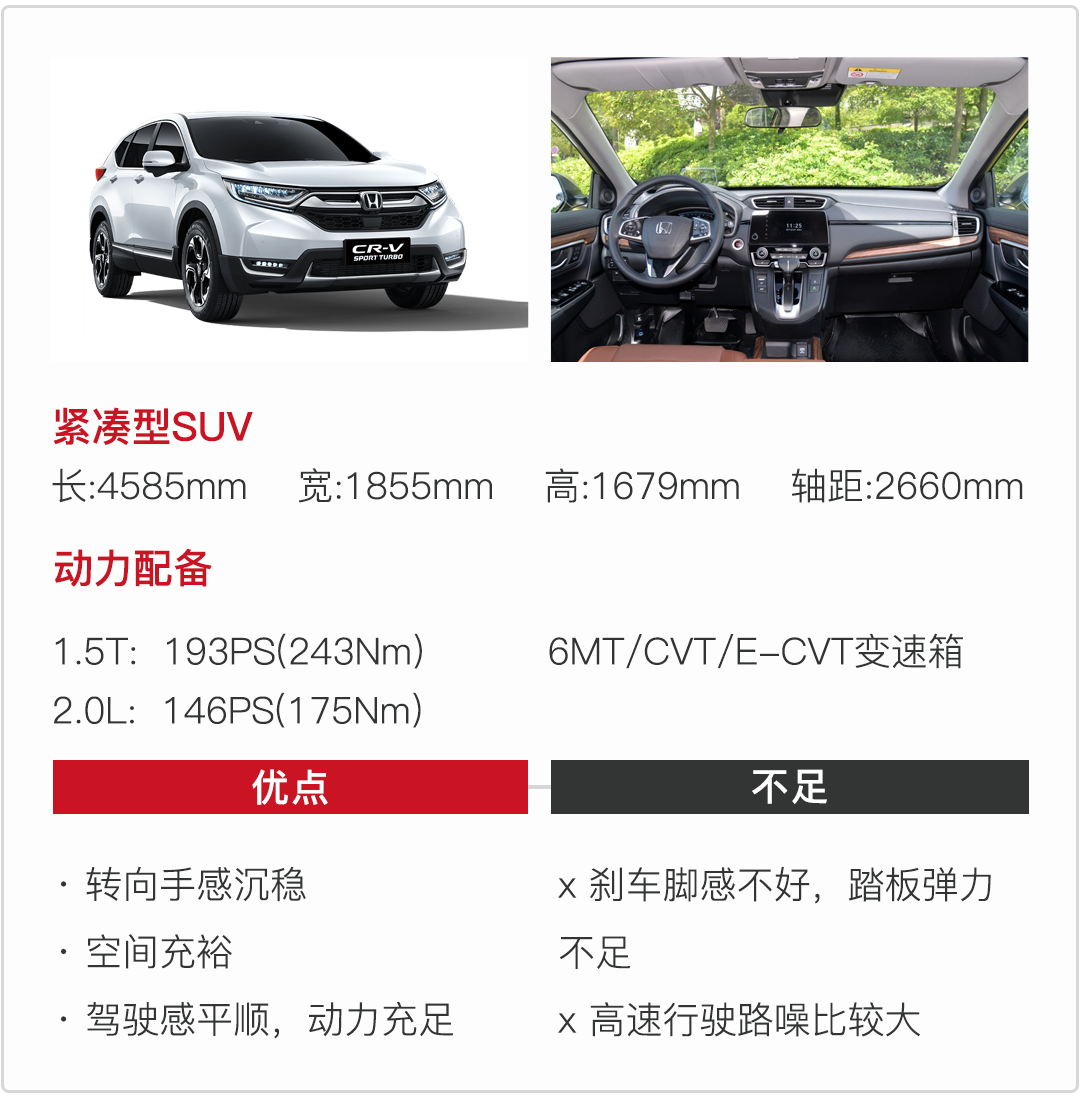 在最近上市的本田CR-V无疑引起了大部分准车主的关注, 新一代CR-V延续了上代车型各项表现均衡的特点,在这个价位里面算是王者级别的存在。新车的外观也是根据现在年轻化的趋势做出了改变,前脸富有力量感的线条,搭配上更大的镀铬装饰条,尾部采用全新设计的L型尾灯,更具视觉效果。新车搭载1.5T,2.0L发动机(混动版本),1.5T发动机跟CVT变速器的匹配达到了很高的水平,行驶起来非常平顺,动力表现也让人满意。转向手感比较沉稳,并没有某些人口中所说的“日系飘”。底盘的调校也比较舒适,大大小小的震动都能很好过滤。然而,车无完车,CR-V行驶时路噪还是比较大的,另外刹车踏板的回弹力不足,踩刹车的力度比较难把握,市区走走停停驾驶的时候还是比较容易疲劳的。