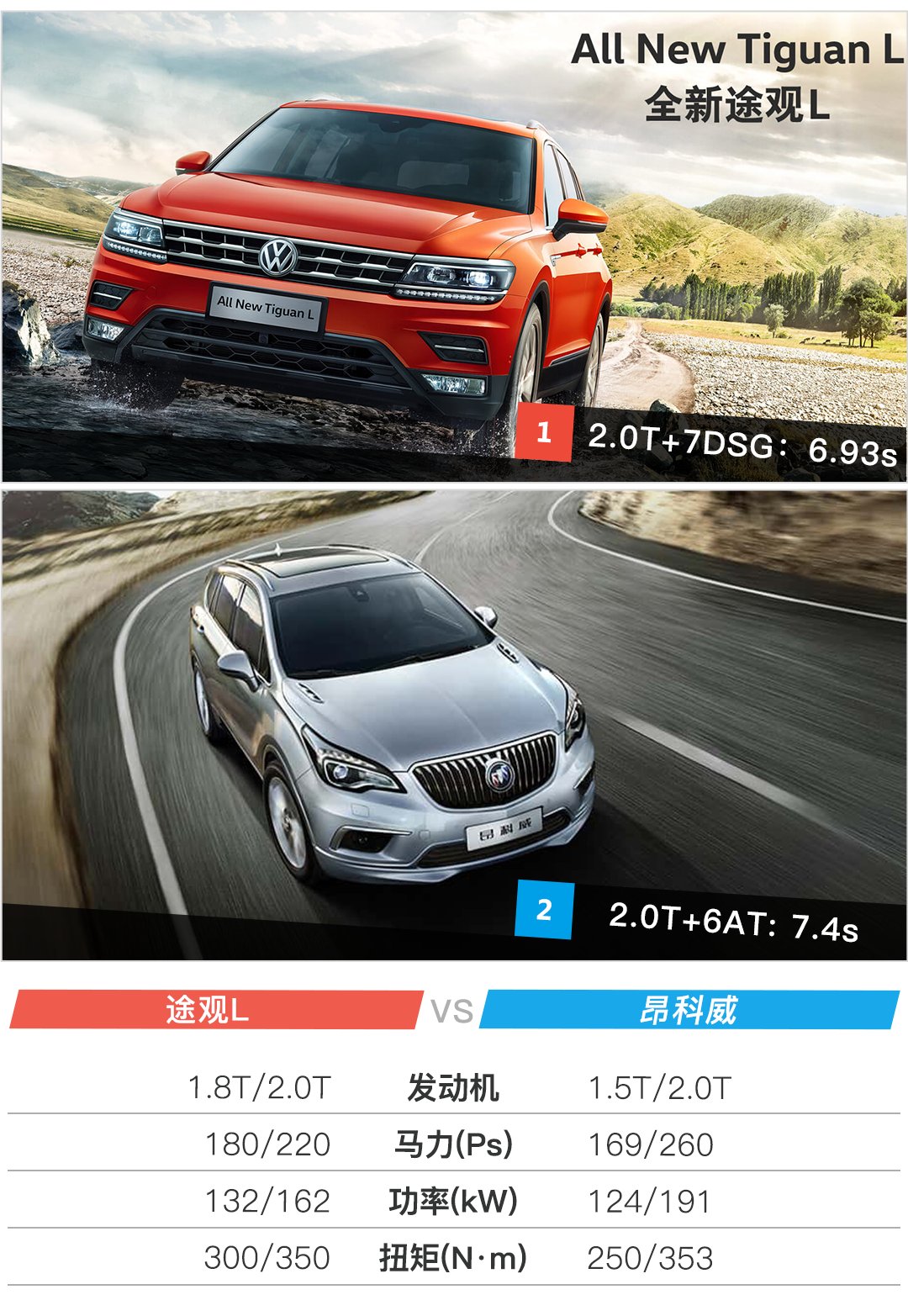 昂科威则采用1.5T+7DCT、2.0T+6AT两种动力组成,后者动力参数数据比途观L2.0T车型的看起来更占优势,但是实测的0-100km/h加速时间为7.4s,虽然够快,但还是略慢于对手。