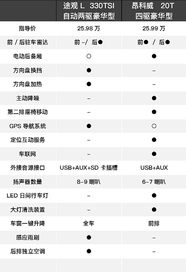 四、配置:途观L注重驾乘感受,昂科威偏向舒适性