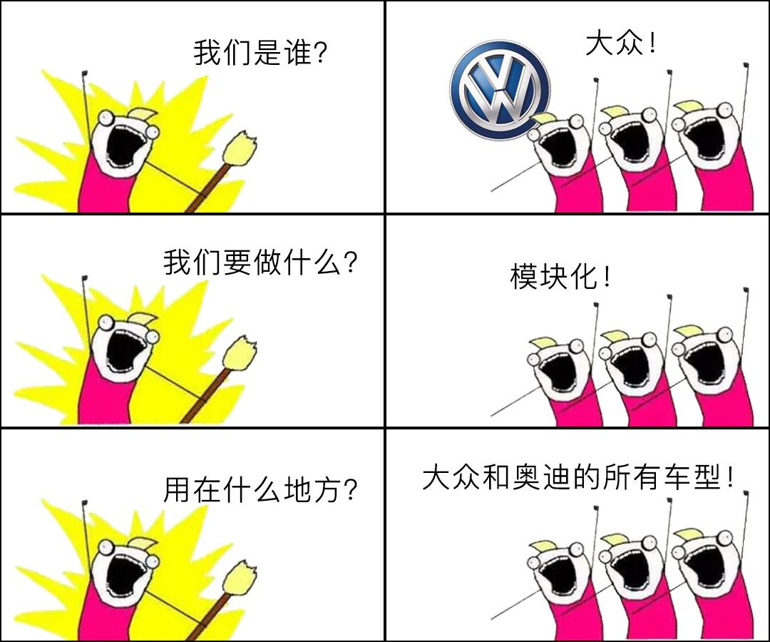 大众的模块化平台,我们可以说说MQB平台,市面上下至高尔夫,上至奥迪TT都在用。大家对这种“换汤不换药”的做法抱有不同的态度。教授认为,MQB平台的根本在于发动机模块的位置是固定的,在这个基础上,可以增加不同的套件与配置,所以在同一个平台上的车型可以有着明显差异的调校和产品特性,奥迪TT是一款短小紧促动力迅猛外观骚气且极富可玩性的跑车,但迈腾是一款舒适性为主导,行政商务气息浓郁的中型轿车,但它们都叫MQB。
