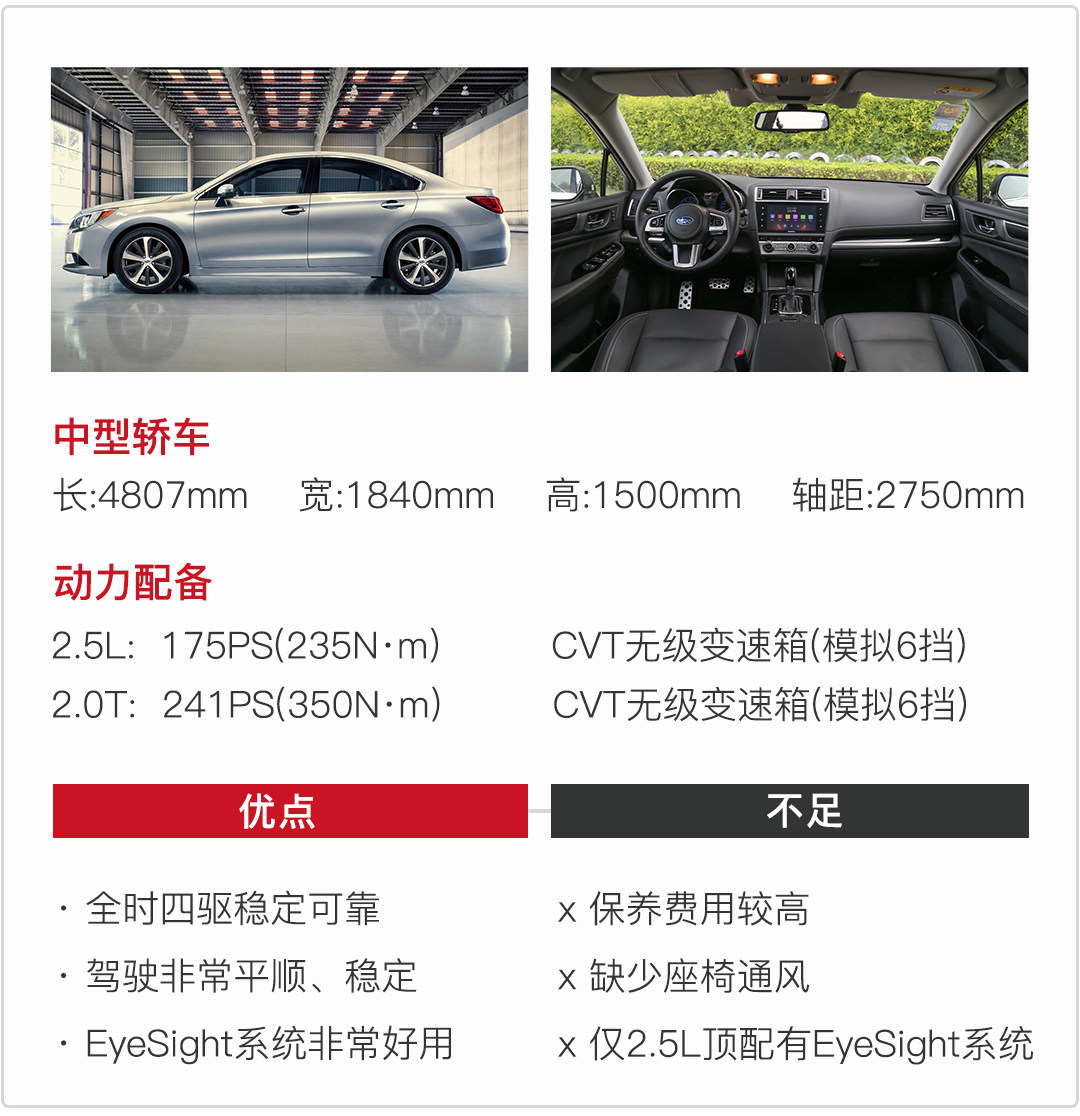 斯巴鲁力狮是少有的配有全时四驱的中型轿车,全系标配全时四驱系统,后桥最多可以获得50%的动力输出,同级别同价位几乎没有,搭配CVT变速箱,动力输出平顺稳定,底盘厚重沉稳,而且极限不低,转向清晰,驾驶感受舒适又带一点操控乐趣,总的来说力狮是低调冷门车型的不错的选择。