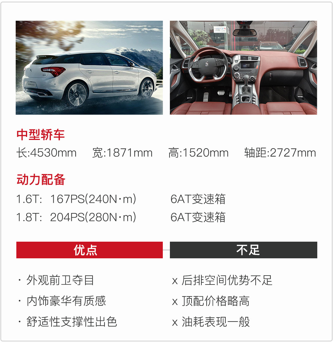 法式浪漫风格的DS 在造型上非常特立独行,很多人接受不了,但是教授觉得这正是DS的卖点,行驶在街上依然有很高的回头率;内饰也有很多可圈可点之处,例如整个中控都使用Nappa皮质覆盖(高配才有),这豪华感真是没谁了,尺寸偏大的方向盘,手感不错,很有驾驶欲望;底盘调校的功底也是出乎意料,即使是非独立的后悬,但你绝对开不出非独立的感觉,出色的侧向支撑,厚重扎实的悬架,达到了中型车应有的水准。