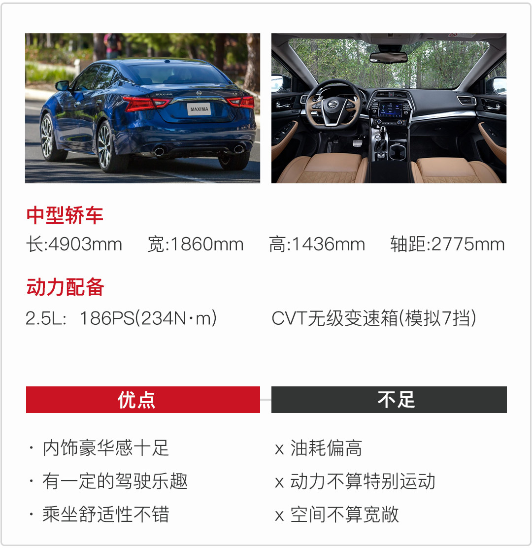 主打豪华运动的西玛在外观上很能打动人,激进的前脸不太像日产的一贯风格,很有冲击力,悬浮式车顶、动感的腰线,颜值非常高;内饰大量采用了皮质和Alcantara材料,豪华运动相得益彰,总体来说除了动力性能不算很强之外,其他方面都非常不错,奈何定位和造型等等方面公众的接受程度有限,销量惨淡。