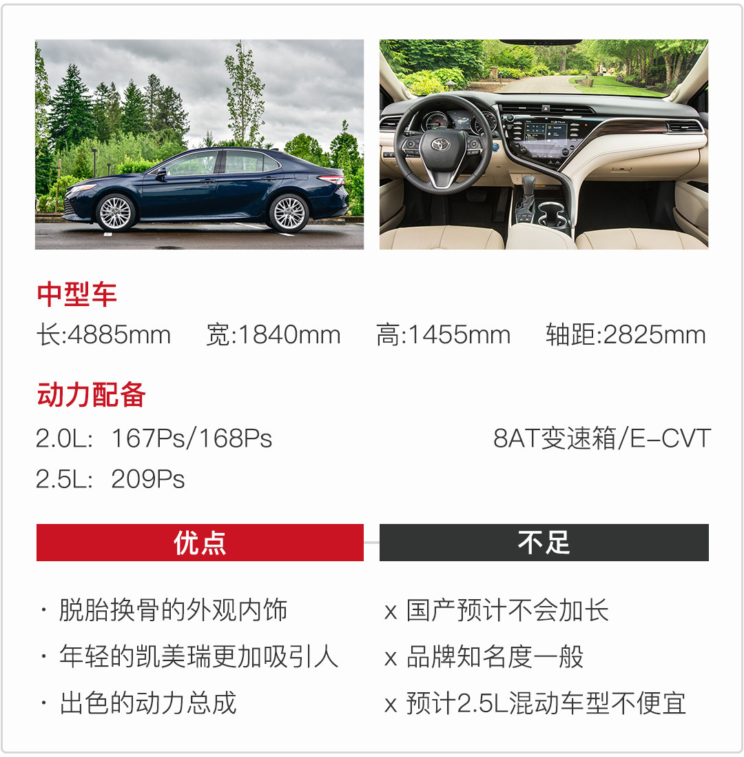 正是出于这样的市场背景,丰田汽车这两年推出的新车都开始激进起来,例如刚介绍完的C-HR就是一款非常激进的SUV。教授曾认为一向中庸的凯美瑞不会表现得太激进,但从如今所获取的消息可知,教授还是太Native了。作为TNGA架构的第一款车型,全新凯美瑞有了脱胎换骨的表现。无论外观与内饰与过去的车型都很难找到联系。全球最高效率的发动机与8AT变速箱肯定是它最大的卖点,当然丰田引以为傲的混动系统也会保留。变得这么陌生,这么运动的凯美瑞,你期待么?假如最后的售价可以跟最近上市的君威保持在17-27万之间,那么在它上市之前教授吃更多的咸菜也是值得的。
