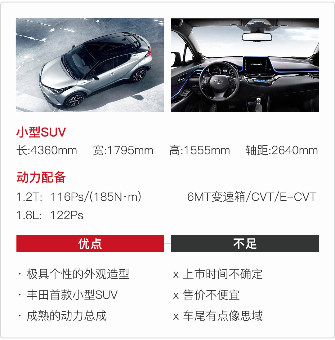 相比于目前丰田推出的车型,C-HR拥有极具个性的造型设计,无论是前脸还是车身线条都与时下的丰田汽车有着明显的区别。这样做的好处是在目前竞争激烈的小型SUV市场,它能够获取更多的目光。虽然它是一台小型SUV,但却拥有2640mm的轴距,预计空间的实用性不会显得太差。假如丰田需要它来打开小型SUV市场,那么C-HR则必然具备一个非常有吸引力的售价。毕竟动力不弱,11万元起步价会是一个好的切入点,混动车型更多是用来提升品牌形象,顶配预计在18万元左右。