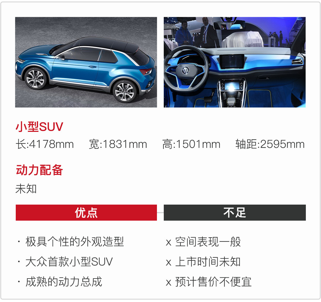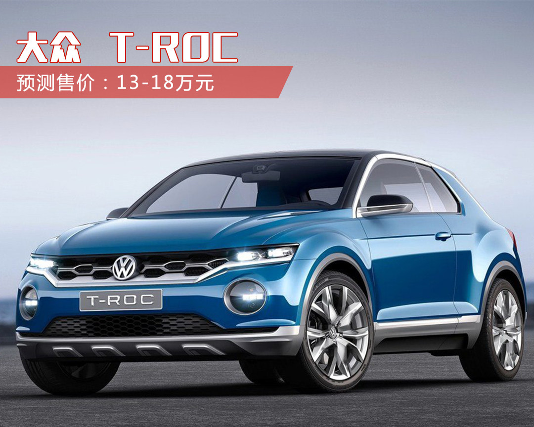 相比于其他品牌,大众这台全新的小型SUV车型-T-ROC透露的消息真的不多。以目前可知的消息,它的外观比以前大众的其他车型都要来得个性一些,显得更像一台概念车。极具辨识度的前脸与扁平化的设计元素相信能吸引不少年轻人的追捧。听说动力总成会与目前的高尔夫共享,预计售价很可能会在13-18万元之间,这样一来虽然性价比不高,但凭借着大众的品牌号召力与个性的外观造型相信能给XR-V与缤智不少的压力。