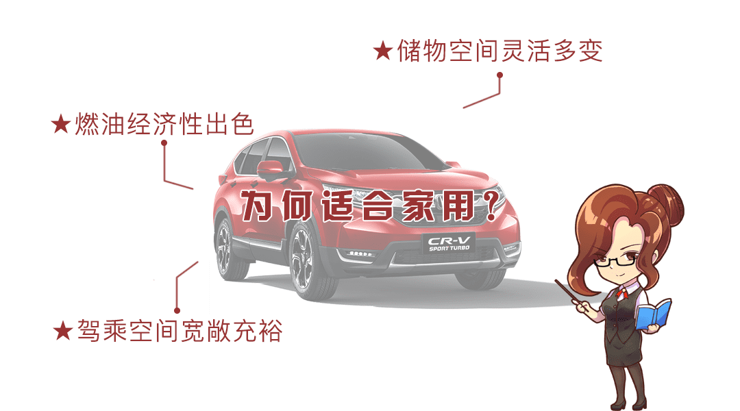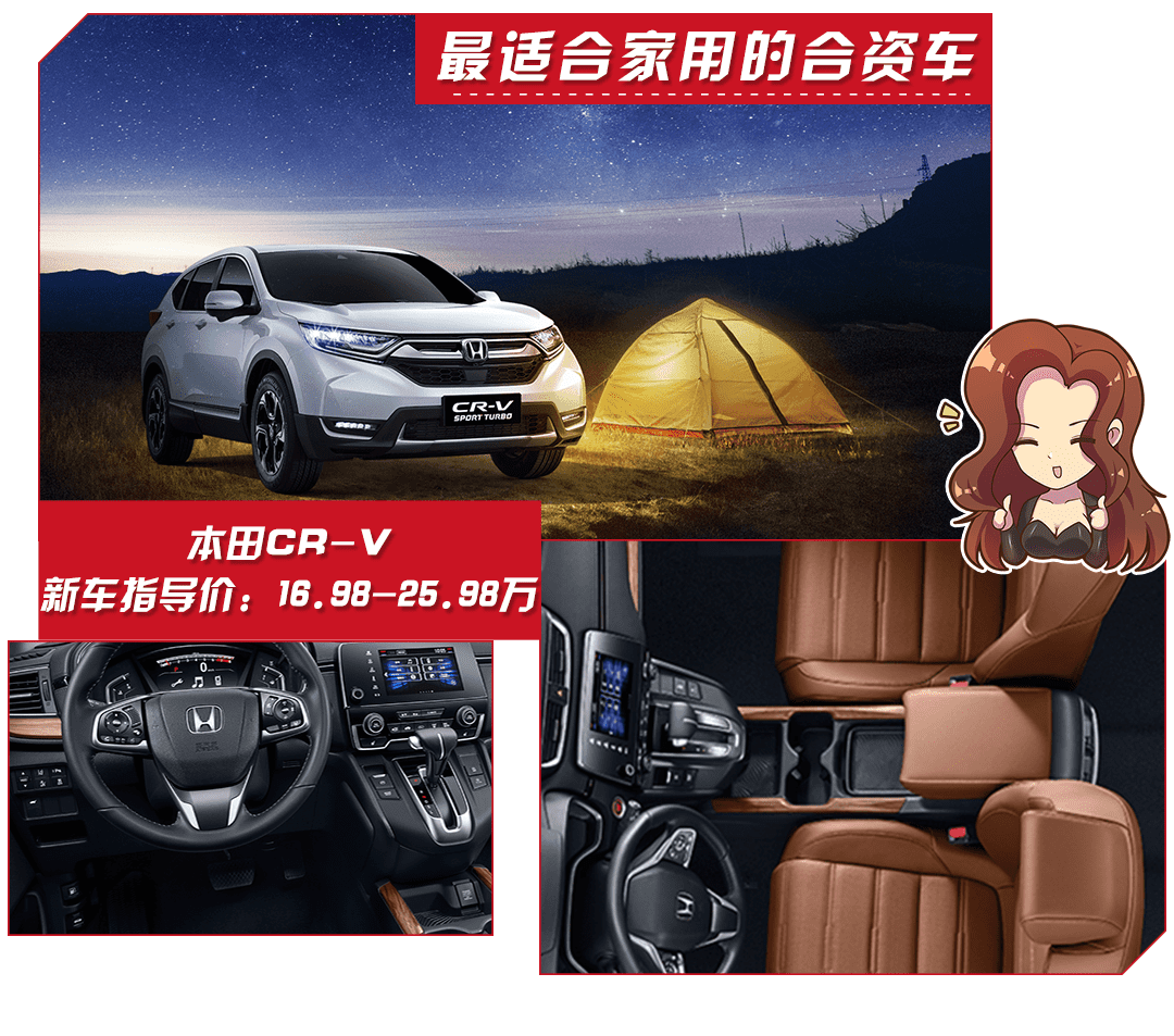 那一姐要推荐大家都非常熟悉的本田CR-V。外观、内饰设计都越来越与时俱进,油耗表现也能让一个家庭非常省心的,储物与乘坐空间更是令人满意。但是有一点一姐想吐槽一下,全新CR-V车身钣金接缝差点把一姐纤细的小拇指卡进去了,真是讨厌!