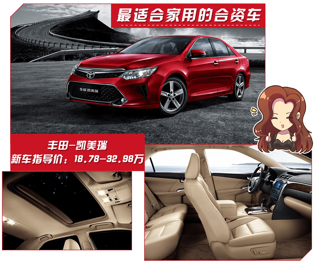 家用轿车图的就是省心耐用,如果对于驾驶没什么需求,又想要有一定的舒适性和高质量保障的话,选凯美瑞没错。