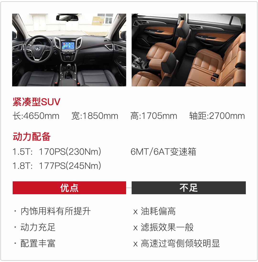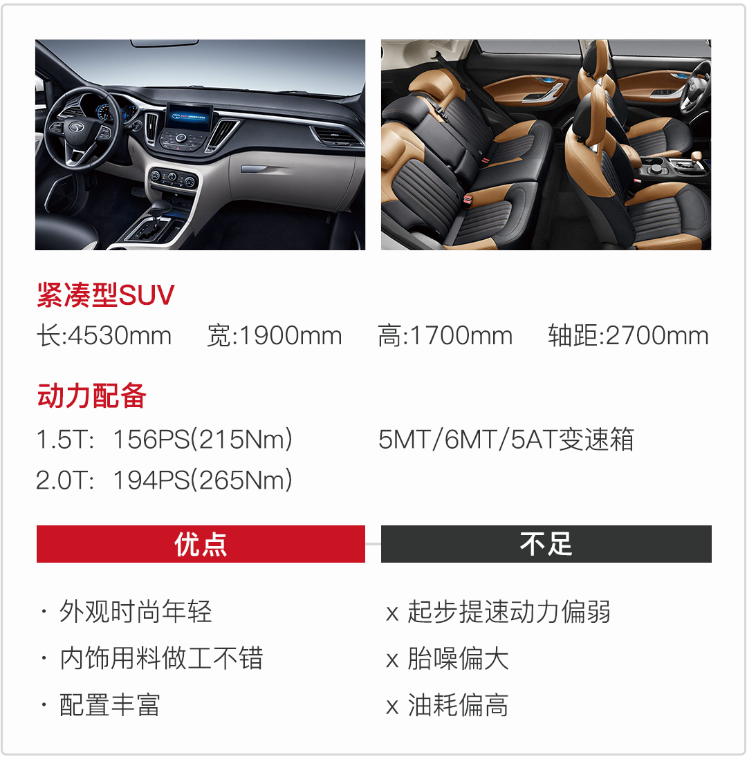 它搭载1.5T、2.0T两款发动机,匹配5MT、6MT、5AT变速箱,1.5T+5AT车型作为销售主力军,破百成绩为11.81s,加速表现中规中矩,变速箱换挡平顺。想追求更大动力的朋友可以选2.0T车型,但是我觉得遗憾的是它只匹配5挡手动变速箱,选择有些单一。