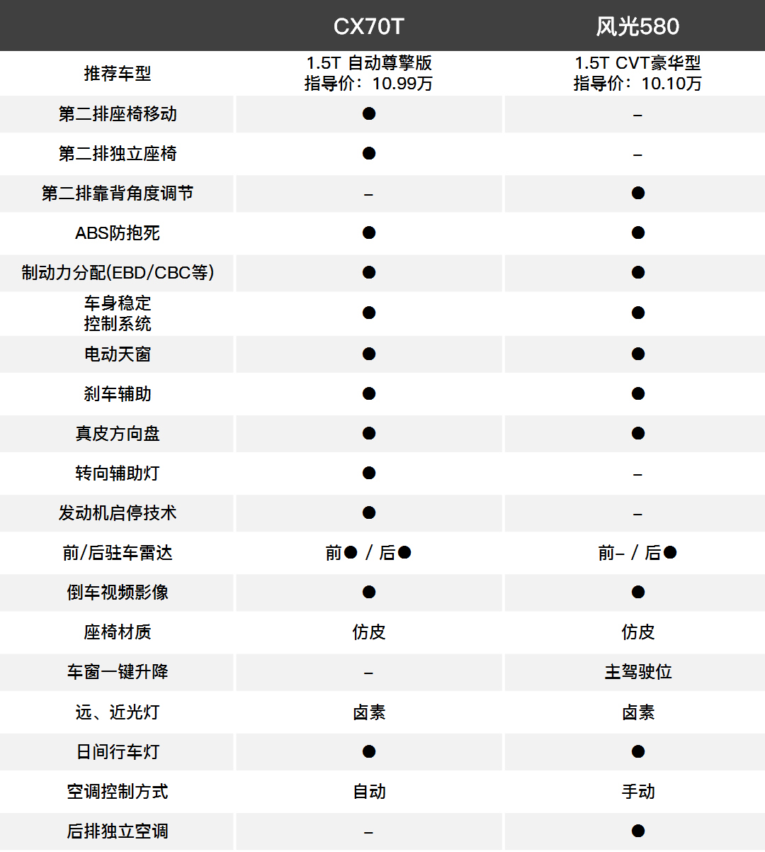 配置上,两车都非常丰富,能够满足日常的使用需求。虽然CX70T的指导价要比580高,但是多了发动机启停技术,转向辅助灯,自动空调控制等配置,并且还配备第二排可移动独立座椅,物有所值。值得一提的是,CX70T没有后排独立的空调,在一点上还是风光580做得更加人性化一点。