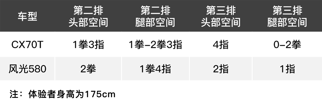 反观风光580除了第二排的头部空间比较充足,其他空间表现跟CX70T比都是略逊一筹,但是第三排座椅的靠背角度还是非常符合人机工程学的,对后背的支撑比较舒服,座椅的舒适度也不错,应急使用完全没有问题。