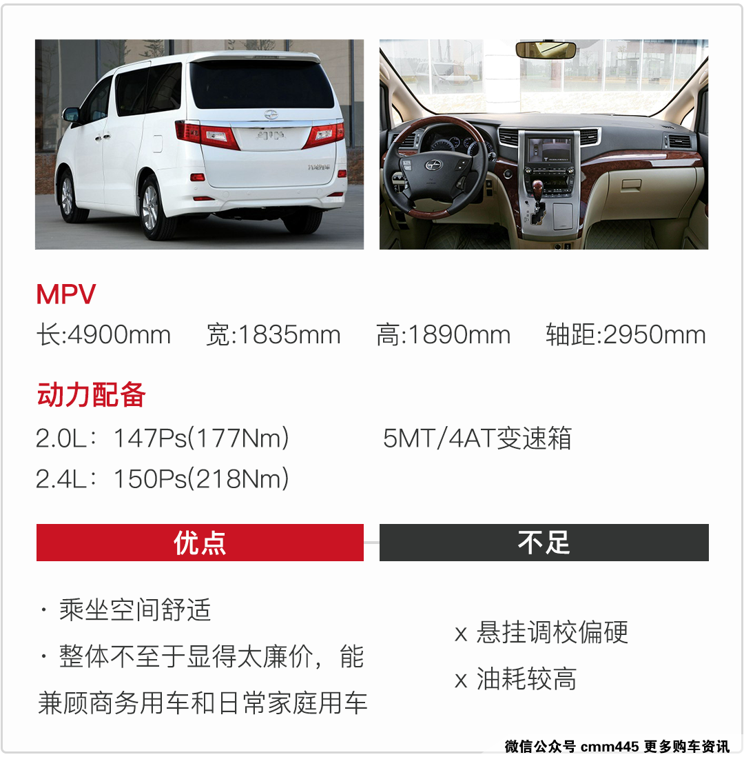 虽然外观是像极了老款的丰田埃尔法,但是内饰造型经过重新设计,有很高的原创度。多功能方向盘、中控显示屏、倒车雷达+影像等等一些常规配置都给你配上了,不过依然是采用5MT变速箱,尺寸还要小了一圈,你愿意买单?