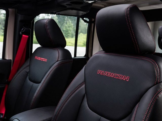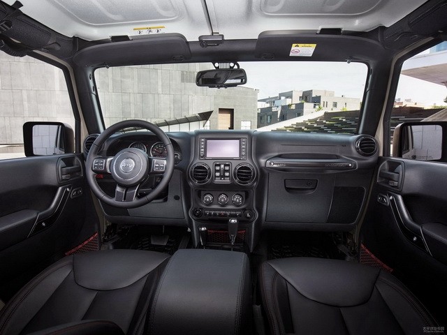内饰方面,新车使用全黑的内饰,在座椅的皮质缝线、安全带使用了红色的搭配,使得内饰没有那么素。多功能方向盘仍然采用传统的三辐设计,仪表盘拥有独家十周年造型,在座椅靠背上也添加了“Rubicon”标志。