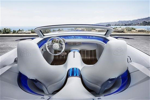 来到座舱部分,全车仅有的两个座舱采用了代表大海的蓝色与白色设计,环抱式的中控台加上纯白的座椅不仅仅让这台车看起来像游艇,开起来也很像游艇。不仅而且,奔驰还将一条带状显示器加入座舱内,以凸显出内饰的豪华感与高科技感。