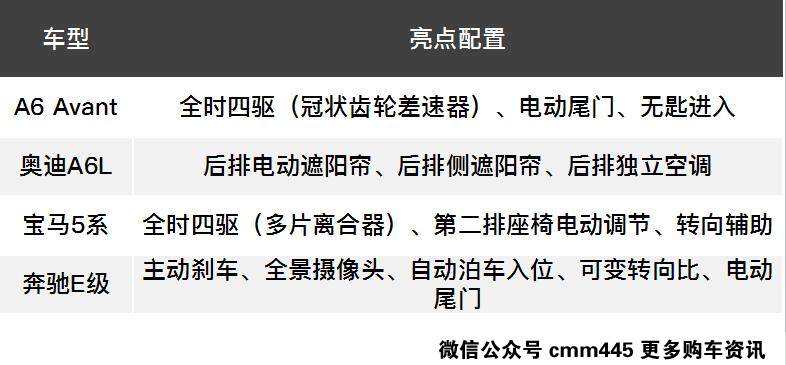不难看出,要想开着舒服省心,消费者妥妥地会选择奔驰E级,因为它的亮点配置主要集中在安全及舒适性方面。奥迪A6L呢,突出亮点的载体过于普通,很难激起消费者的共鸣。A6 Avant和宝马5系则着重在技术层面下功夫,提供的是更为纯粹的驾驶乐趣。