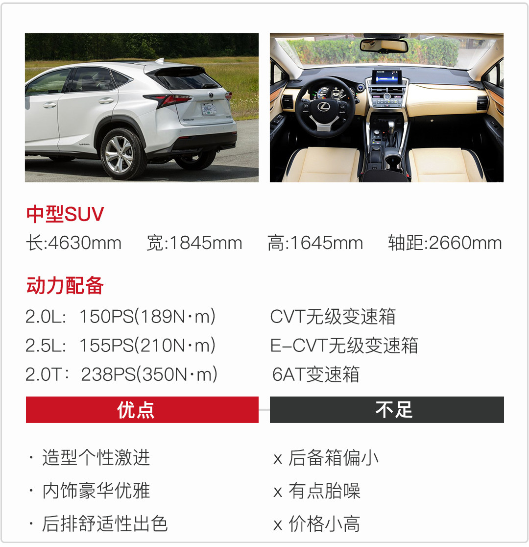 豪华又有个性,非常具有冲击力的造型一直是雷克萨斯的强项,棱角分明的线条,很多车型都说自己的造型有杀伤力,但是在雷克萨斯的车灯面前,教授觉得没有多少车型有足够的底气,NX造型可以用“凶狠”来形容了;不止造型,内饰同样有超前的个性,又不失豪华和优雅,非常动感的线条,层次丰富的布局,去看看NX再去看其他SUV,你绝对忘不了雷克萨斯的气质。