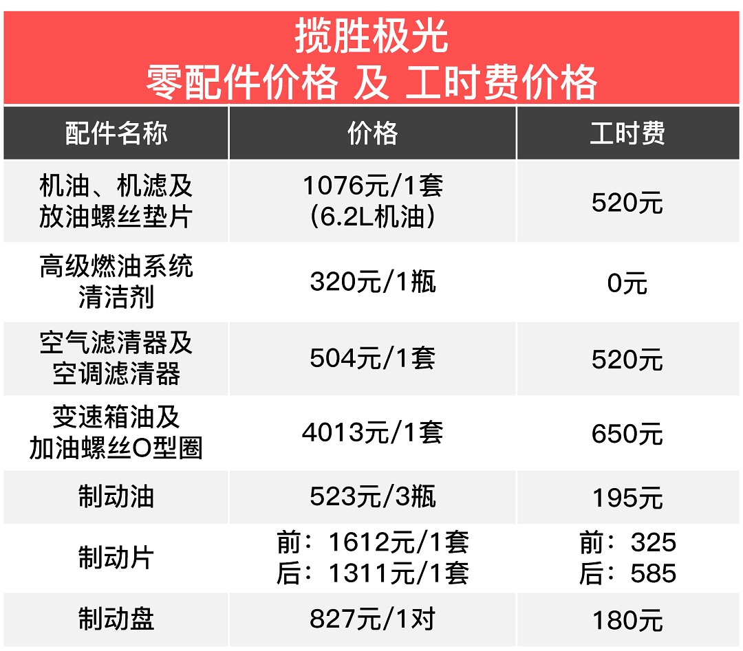 国产极光实行“基础保养服务包”形式常规保养,每次更换机油和机滤以及油底壳放油螺丝铜垫片的A套餐为1596元,B套餐则为三滤全换(A套餐基础上增加空气滤清器、空调滤清器),价格为2620元。