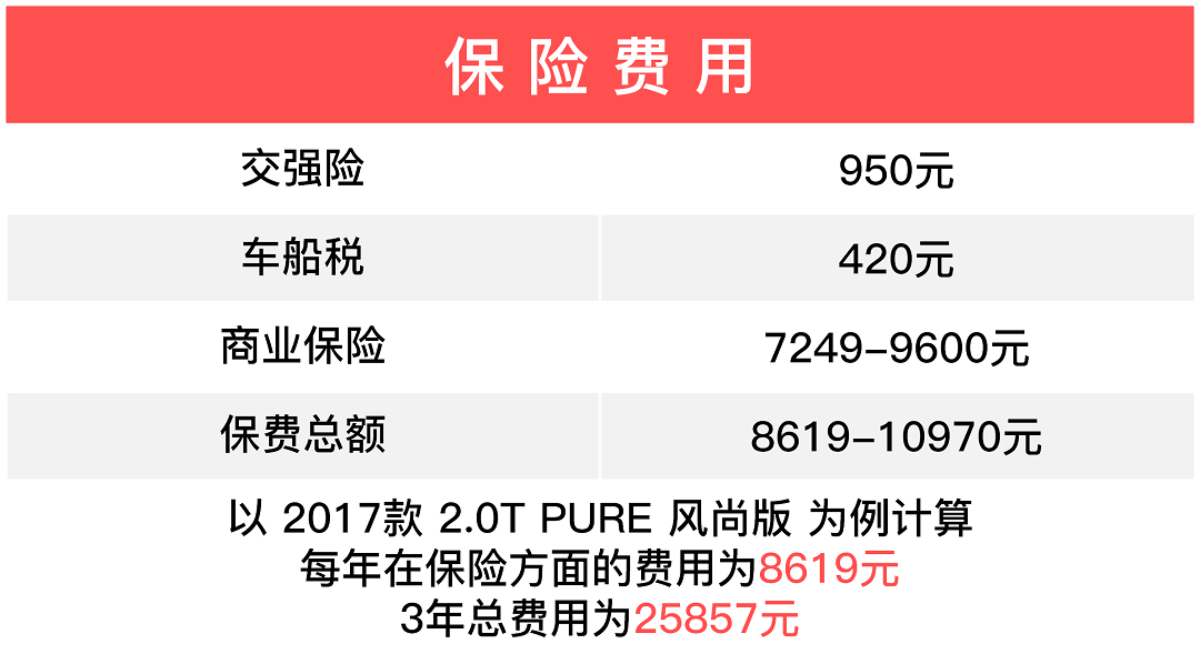 保险的话一年接近一万了,而且表格统计保险内容仅包括:50万第三者责任险、车损险、不计免赔,实际保险价格各地存在差异,按实际当地收费为准。
