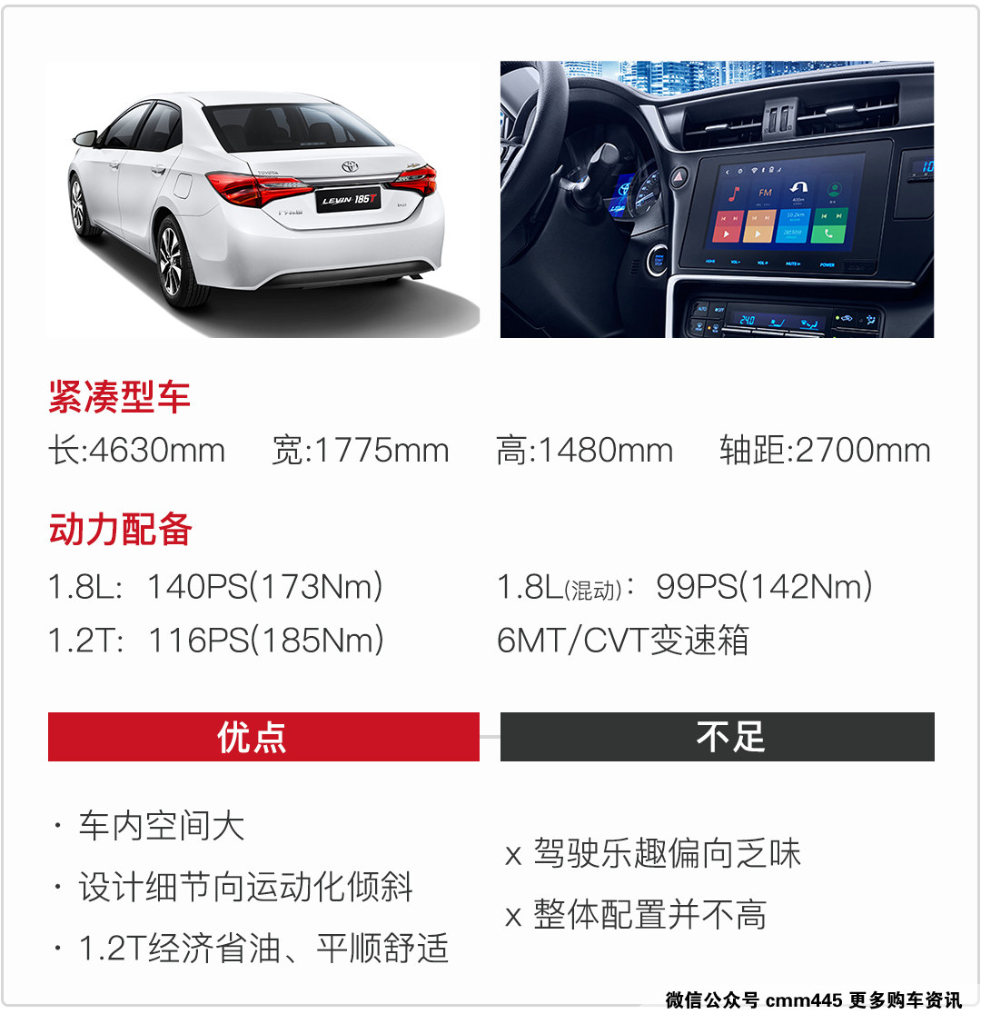 雷凌1.2T并没有在车型特性上展现出与自吸车型有什么太大的不同,依然还是一种踏实省心的“丰田范儿”,除了发动机形式以外,CVT的变速箱也进一步保证了行驶平顺性,与自家同胞兄弟卡罗拉相比,雷凌有着更运动的外观设计展现,更讨好年轻一代的消费者,所以如果想省心、经济、还有一定个性的话,倒不如考虑一下雷凌的1.2T版本。