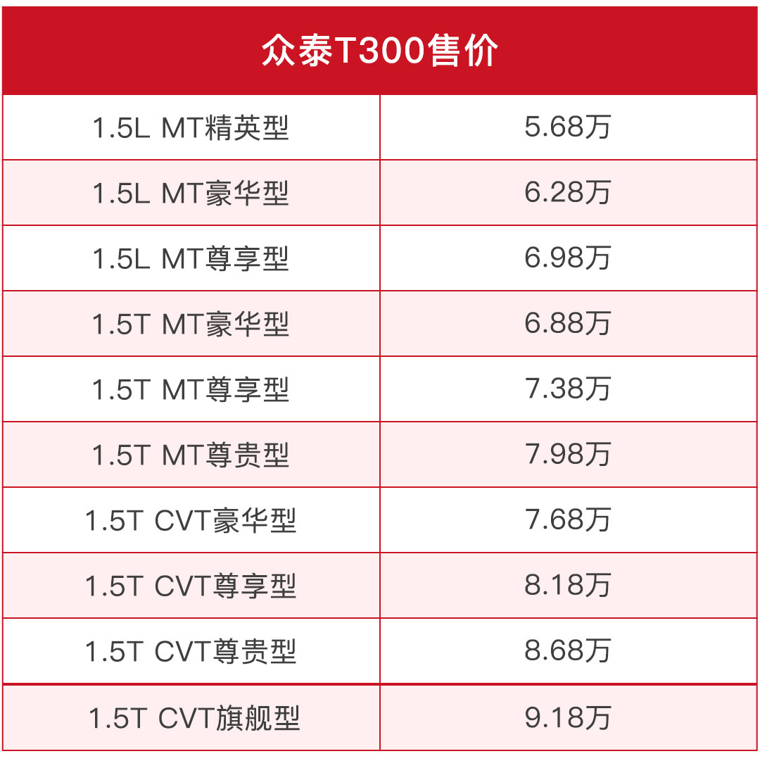 目前众泰T300一共推出了10个车型,5.68-9.18万售价在目前的自主小型SUV性价比不太突出。不过以它目前的动力总成与空间表现,它仍具有一定的竞争力。相比于对手,它丰富的配置也是一大亮点。盲点监测、全景天窗、中控大屏、自动空调以及远程控制等一系列颇具噱头的配置可以让它吸引不少注重实用性的年轻人。