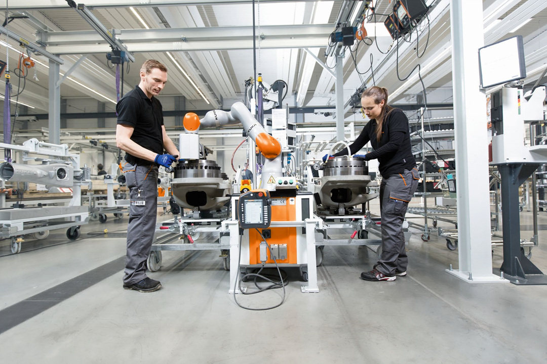 这个工作台上有KUKA标志的机器人叫iiwa,它可是这现在的明星机器人,安全性高,可以和人一起工作。所有的机器人生产线也由KUKA自己生产,所有设备都已接入网络,有云端的大数据来记录生产过程,哪怕一个螺丝钮紧用的力也被详细记录,如果生产线上哪台设备发生异常会自动报警,系统定位设备及出错的问题是什么,然后工程师前来检修,非常先进。