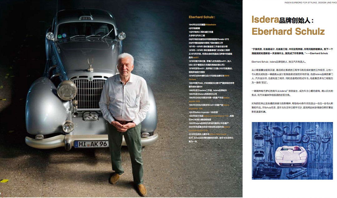活动的接近尾声,我们走访一个传奇的品牌爱斯德拉(Isdera),Isdera的创始人Enerhard Schulz,也是个传奇的人。13岁开始工作机械打交道,大学学习汽车工程,28岁在自家洗衣间里制作跑车,29岁进入保时捷任设计和赛事部门当工程师,8年后离开保时捷开创自己的品牌Isdera,开始制造超跑,现在Schulz已经76岁了,仍然坚持自己的梦想。