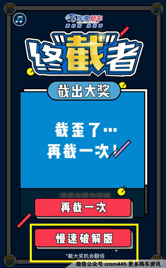 车享新车88节活动还抛出了一个小彩蛋——玩游戏拿大奖,只要参与“终截者争霸赛”,就能拿到实实在在的礼品。“终截者争霸赛”游戏并不复杂,进入游戏界面后,会看到许多快速闪动的礼品,只要瞄准你中意的礼品,精准截图就有机会得到相应的礼品啦!