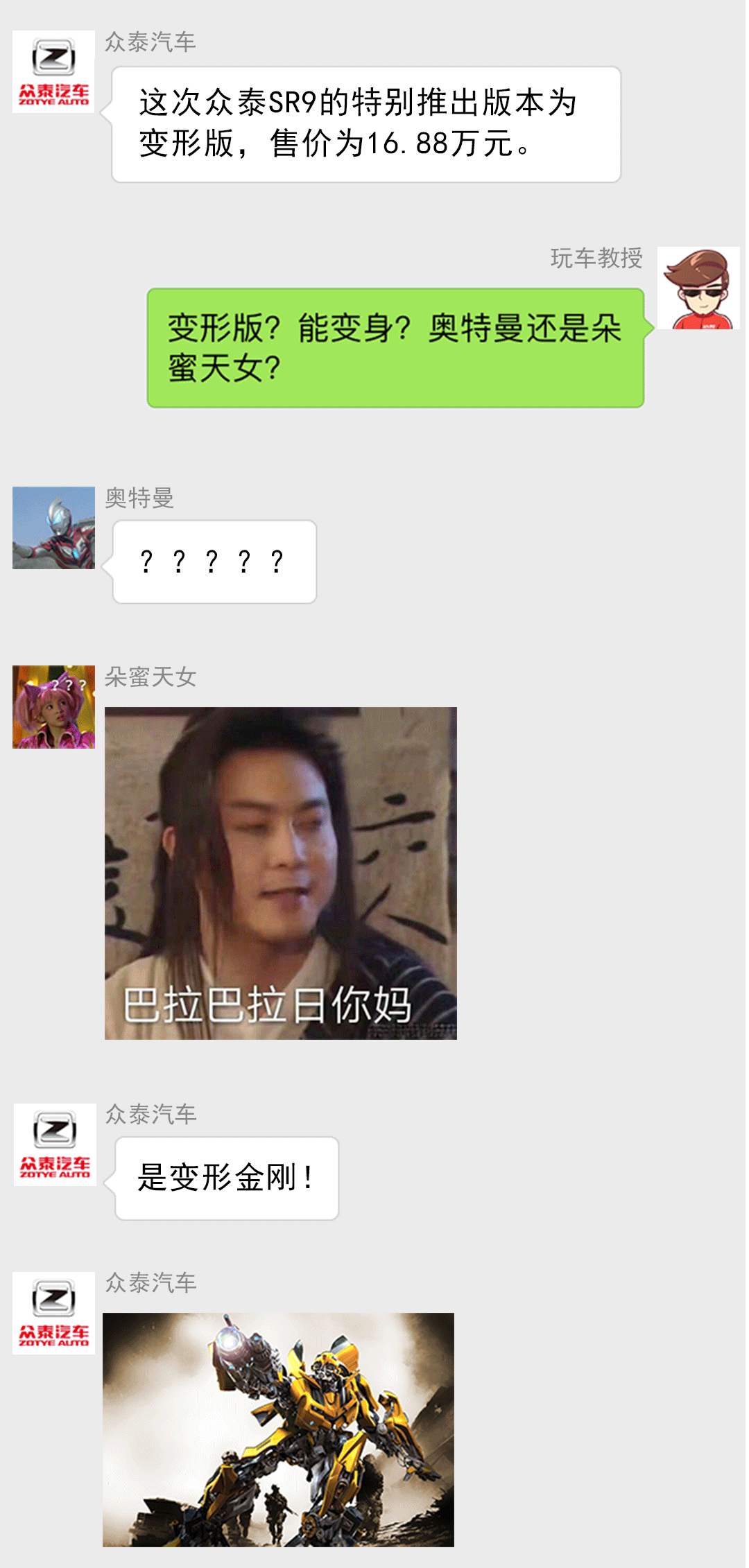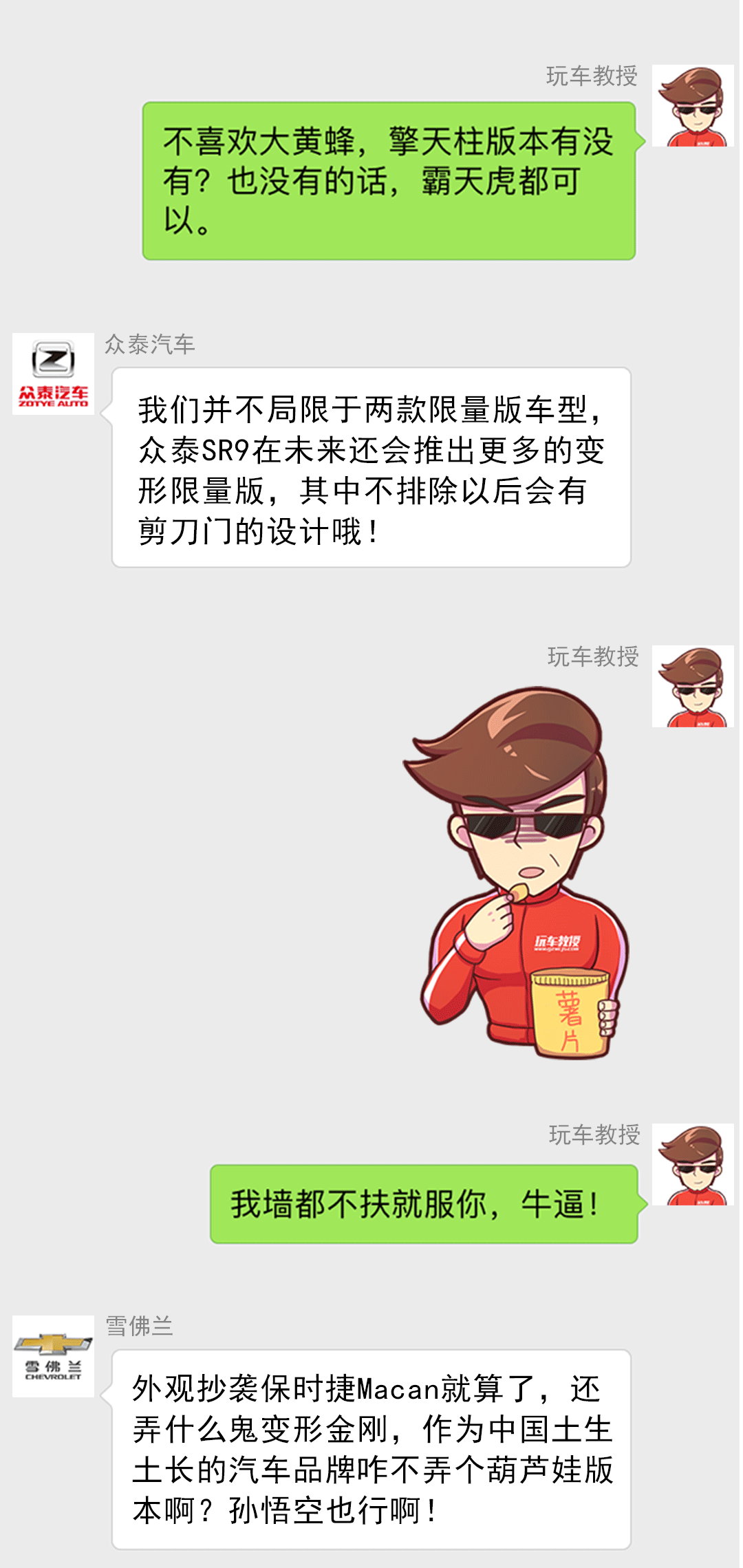而就在近日,众泰再为SR9新增一款变形版车型配置,售价为16.88万元,略低于女神定制版。变形版的特色相比于女神定制版来说更容易令人接受,它的外观采用“宽体”套件凸显运动型,大量运用好莱坞变形金刚电影中大黄蜂元素,车内外都在普通版车型上增加不少限量版标识和黄色的元素。上面提到的两款特别版车型,在三大件方面并没有与普通版车型有区别,仅在感官上增加不少新鲜感。