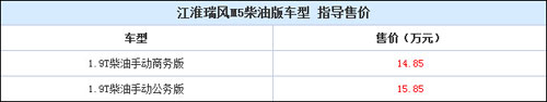 江淮汽车推出两款柴油版瑞风M5车型,新车将会搭载一台1.9T柴油发动机,共分为商务版和公务版两种车型,新车售价为14.85-15.85万元。