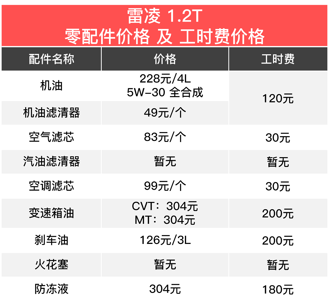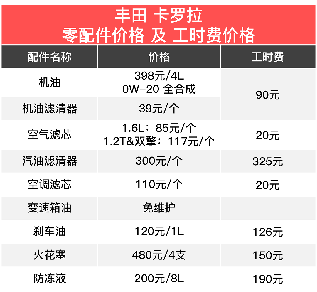 零配件价格跟卡罗拉相差不大,除了用的机油略有不同,另外卡罗拉变速箱是免维护,其他价格区别不大。