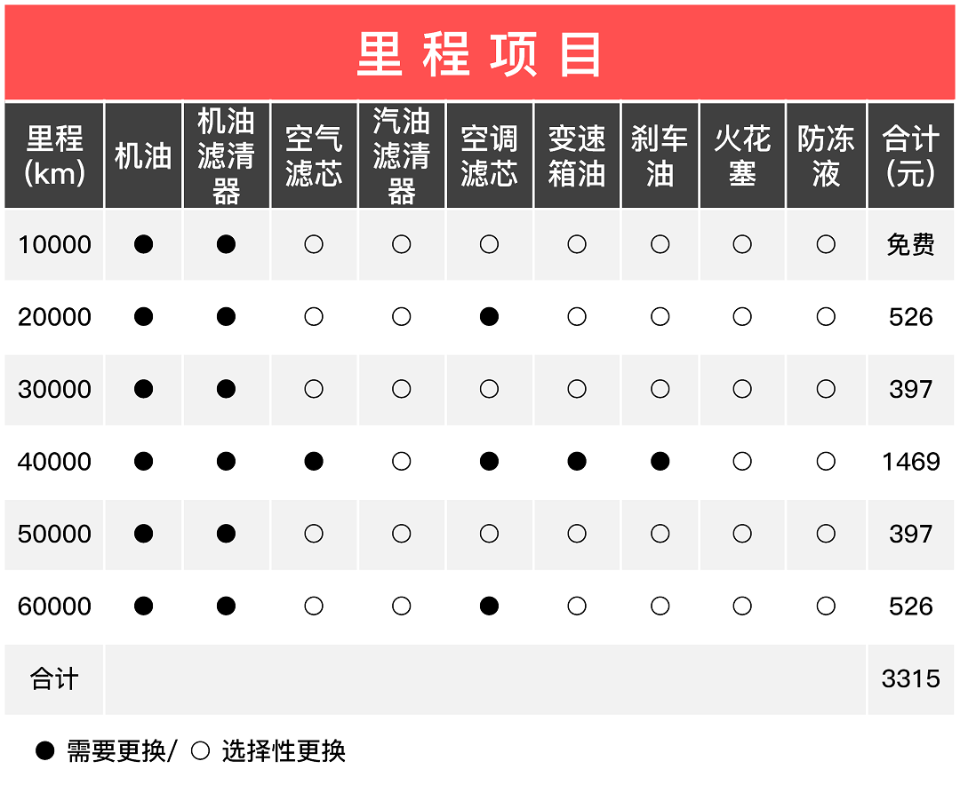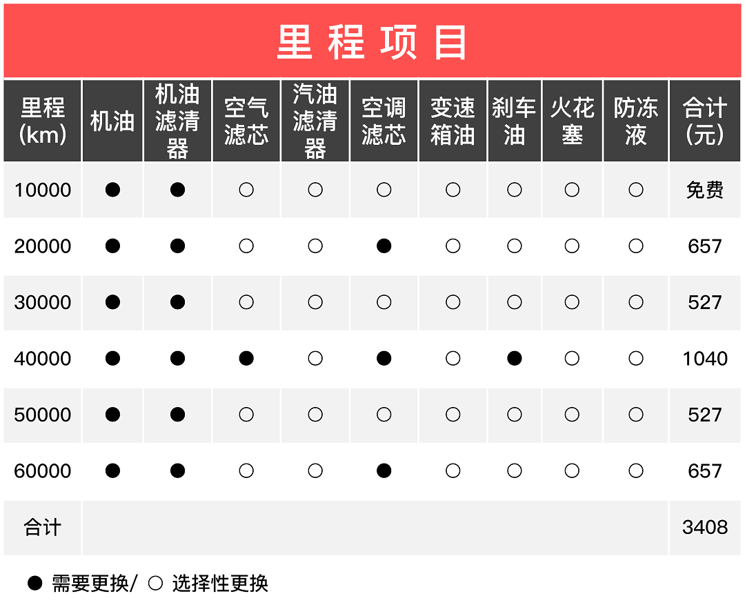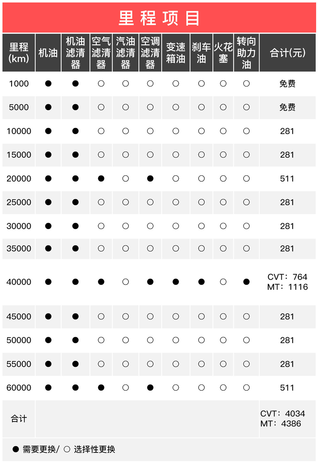 同样是首保一万公里,保养间隔为1万公里,保养项目和卡罗拉几乎一模一样,价格亦然。