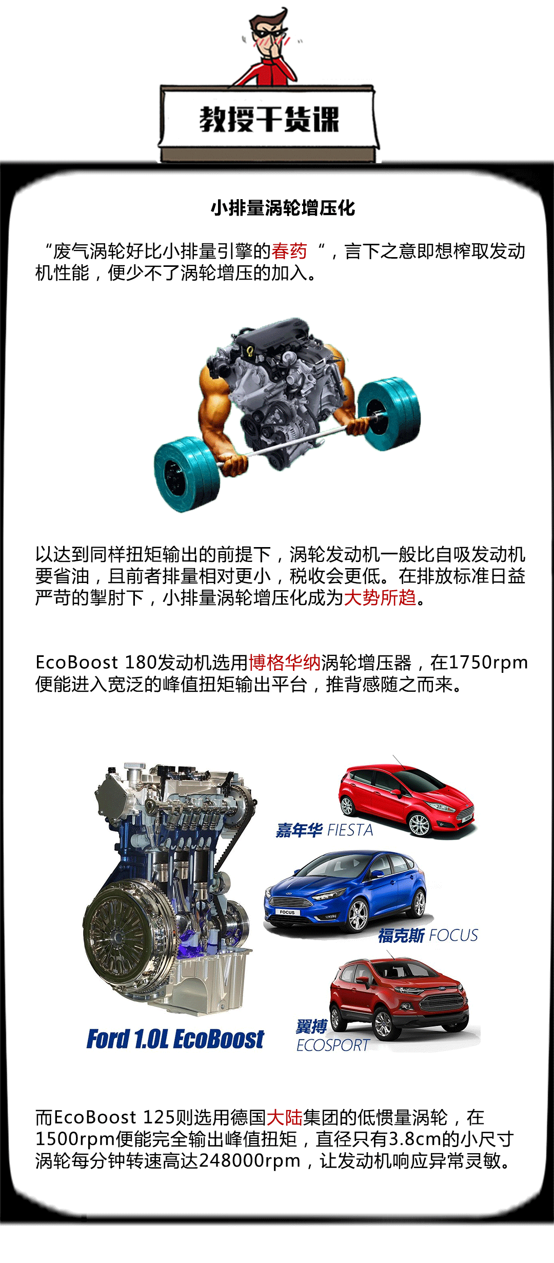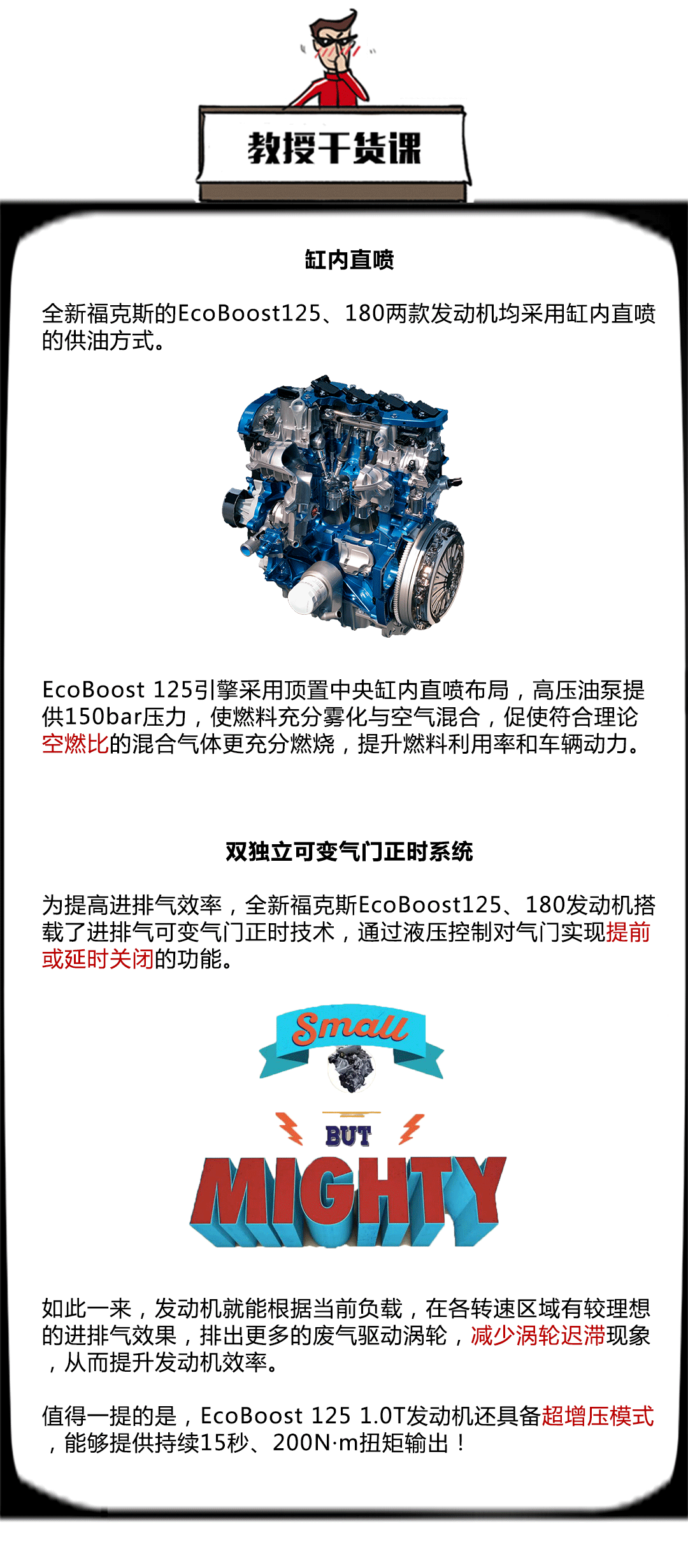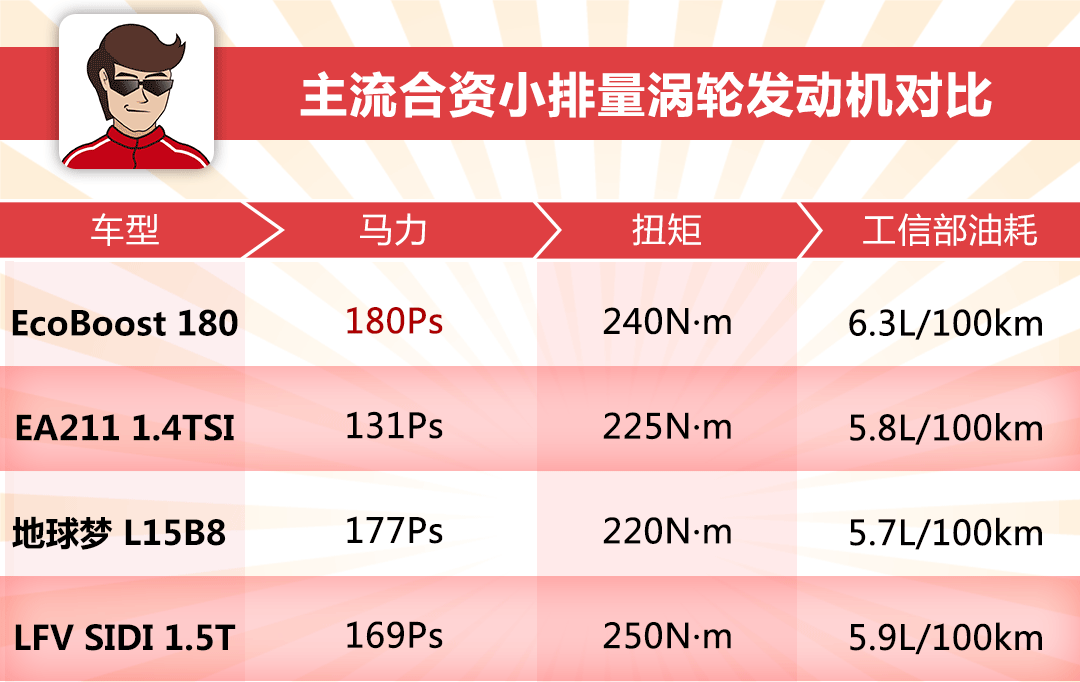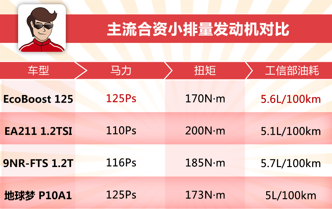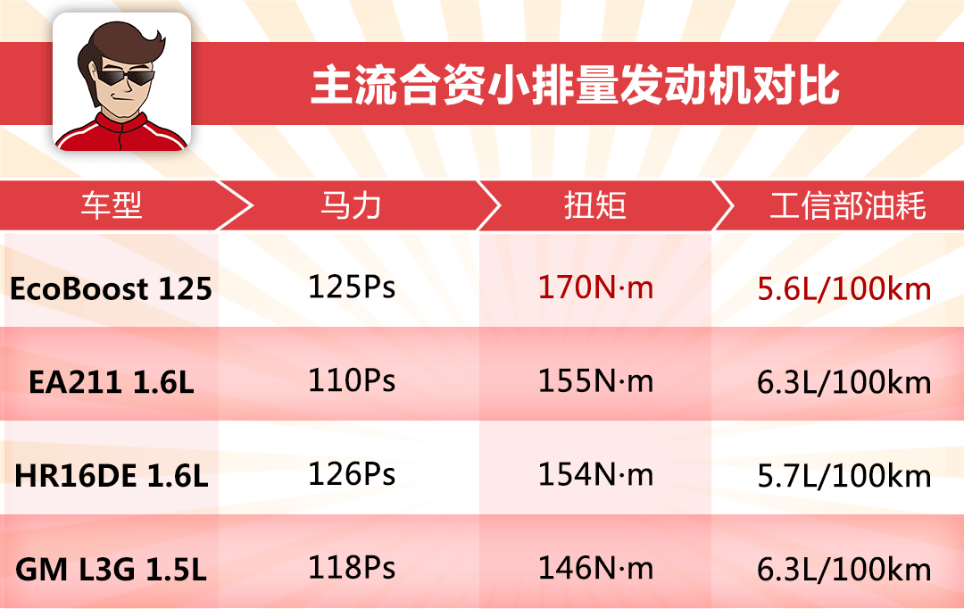 结论:从上表可知,相比主流的合资小排量自然吸气发动机,EcoBoost 125无论在净功率、扭矩以及油耗表现方面都略胜一筹,实力上演以少胜多,敢为人先地推动小排量涡轮化在行业的发展。