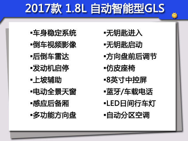 这款车属于1.8L版本的顶配车型了,价格与1.6T 自动智能型相同,除去动力和变速箱总成不说,配置方面自然1.8L 自动尊贵型的更丰富些。1.8L版本的自动尊贵型比自动智能型贵一万块钱,多出来的配置有: