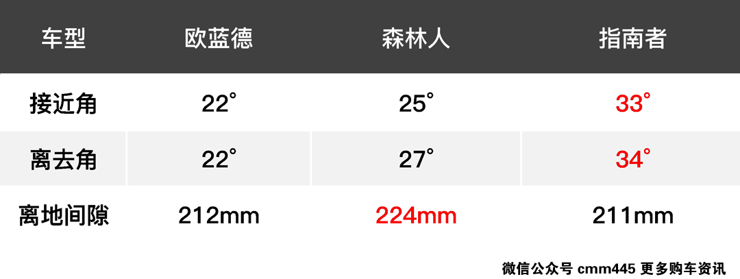 从以上三个数据又可以看到,指南者的接近角和离去角都很出色,虽然离地间隙不及森林人,但是也不容易拖底。欧蓝德虽然三个数据都表现得很一般,但是4705mm的车身长度让其不容易形成交叉轴的情况。